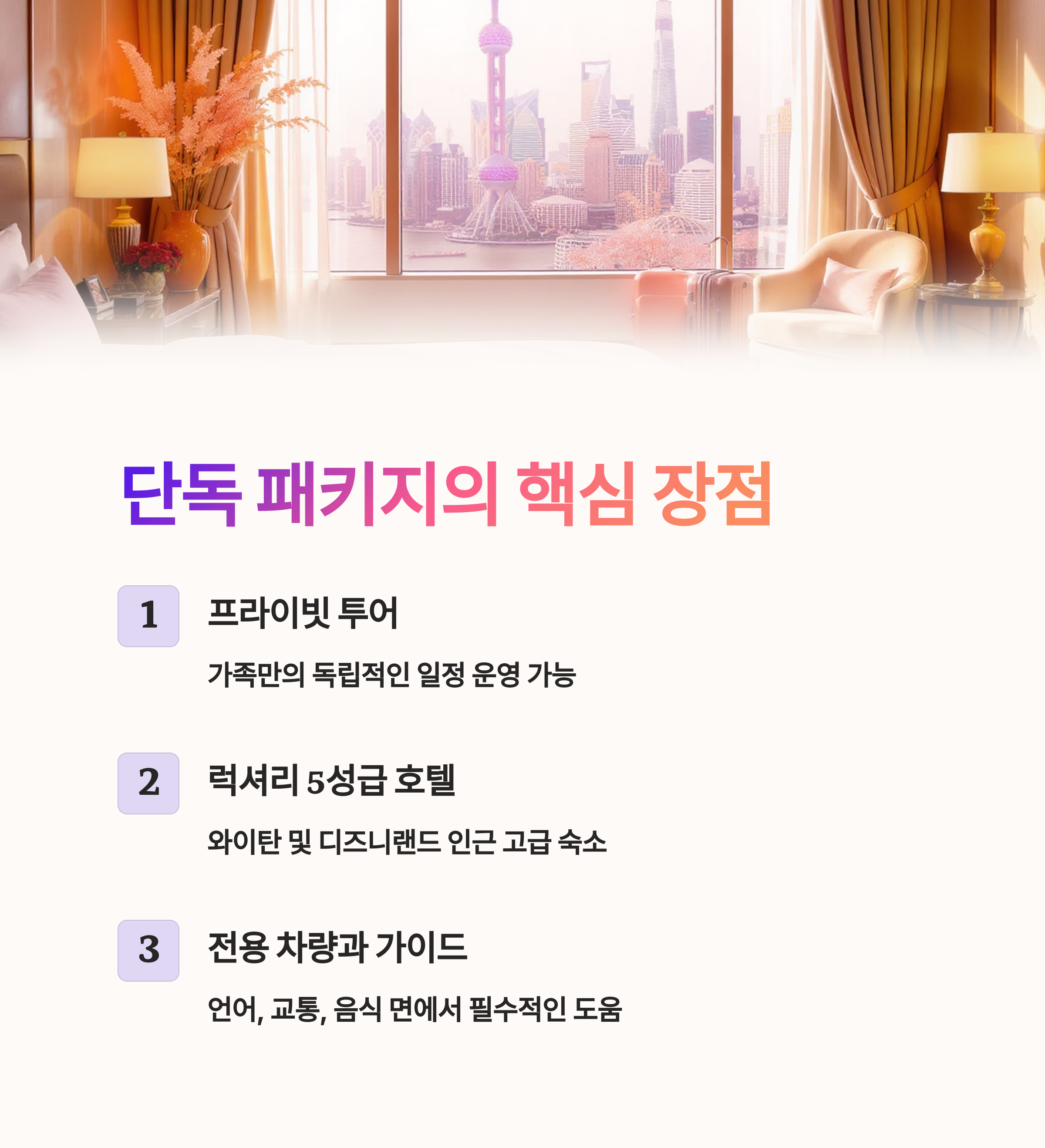 비용은 단독 패키지가 높지만 가족만의 독립적인 일정 운영이 가능하다는 점에서 강점이 있습니다.