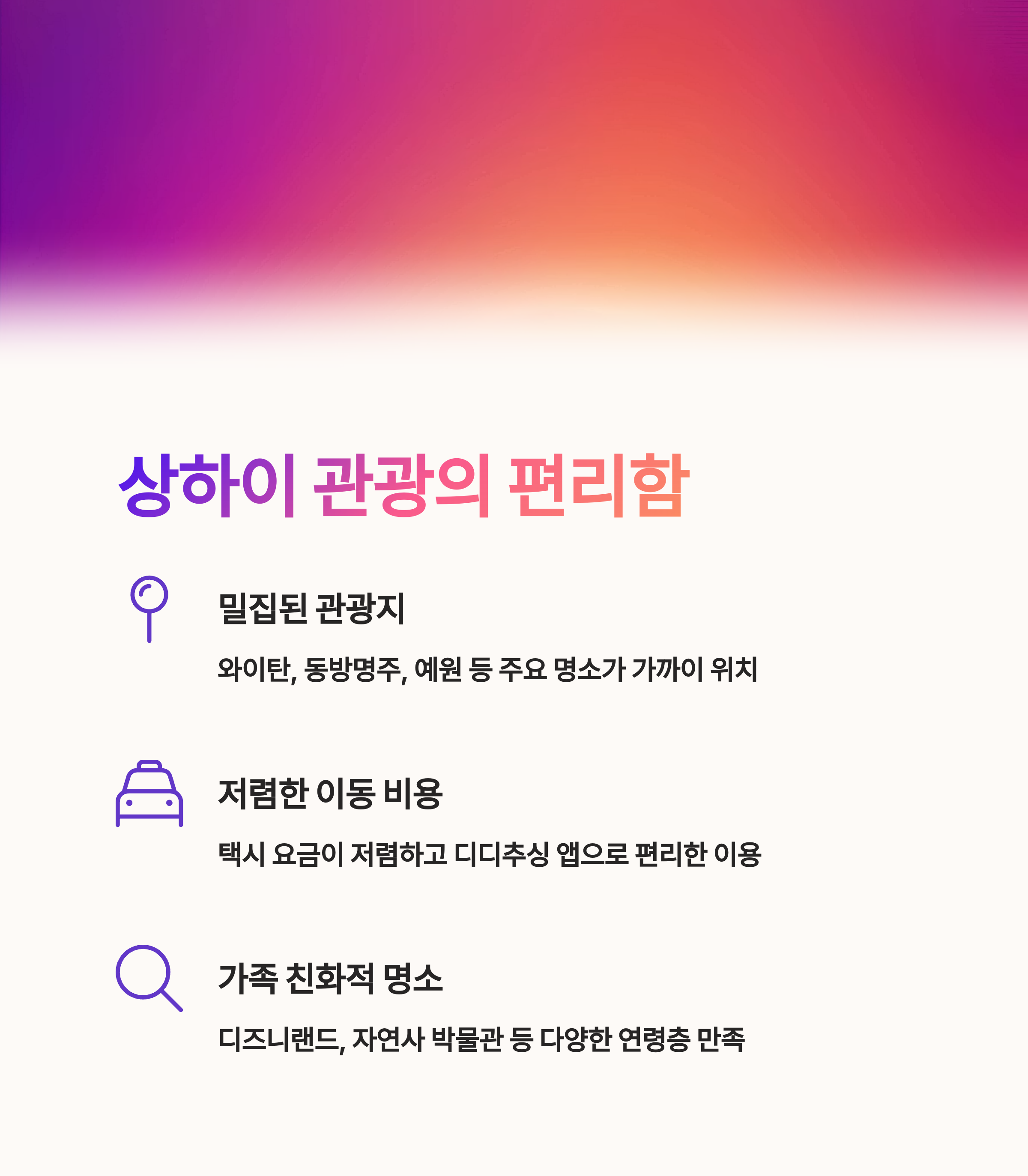 또 다른 장점으로는 상하이의 주요 관광지 밀집, 저렴한 택시 요금, 택시 앱인 디디추싱(滴滴出行) 활용으로 이동 비용 부담이 낮다는 점입니다.