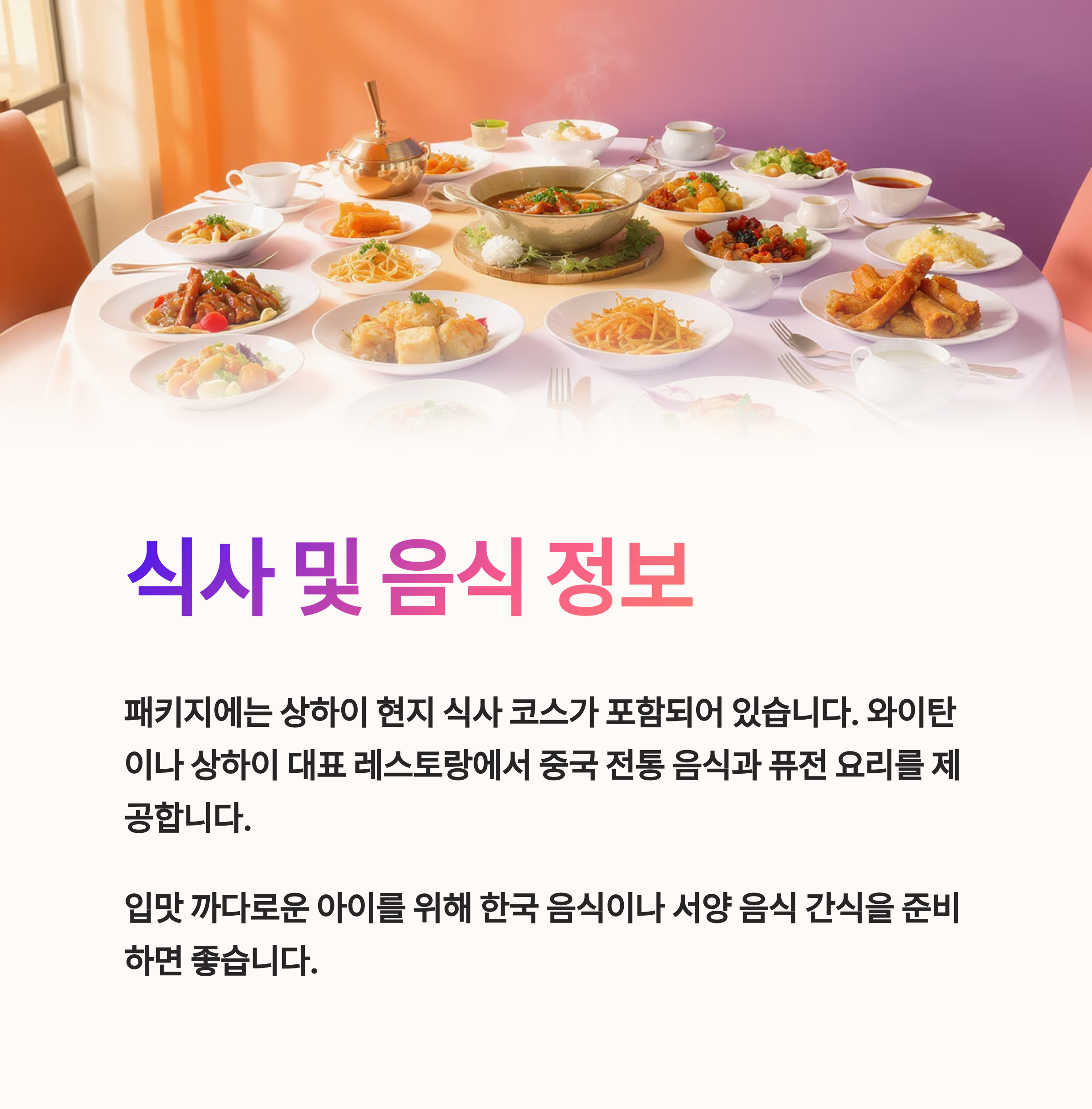 | 단독 패키지에는 상하이 현지 약속된 식사 코스가 포함되어 있습니다. 중국 전통 음식과 현대 스타일의 퓨전 요리가 혼합 제공됩니다. 일반적으로 제공되는 음식은 와이탄이나 상하이 대표 레스토랑에서 제공되어 수준이 높습니다. 그러나 아이들이 음식에 익숙하지 않을 수도 있기 때문에, 특히 입맛 까다로운 아이를 위해 한국 음식이나 서양 음식 간식을 개별적으로 준비하면 도움이 됩니다. 가이드가 동행하면 추가적인 음식 옵션 제공 가능성도 있으니 요청해 보세요. |