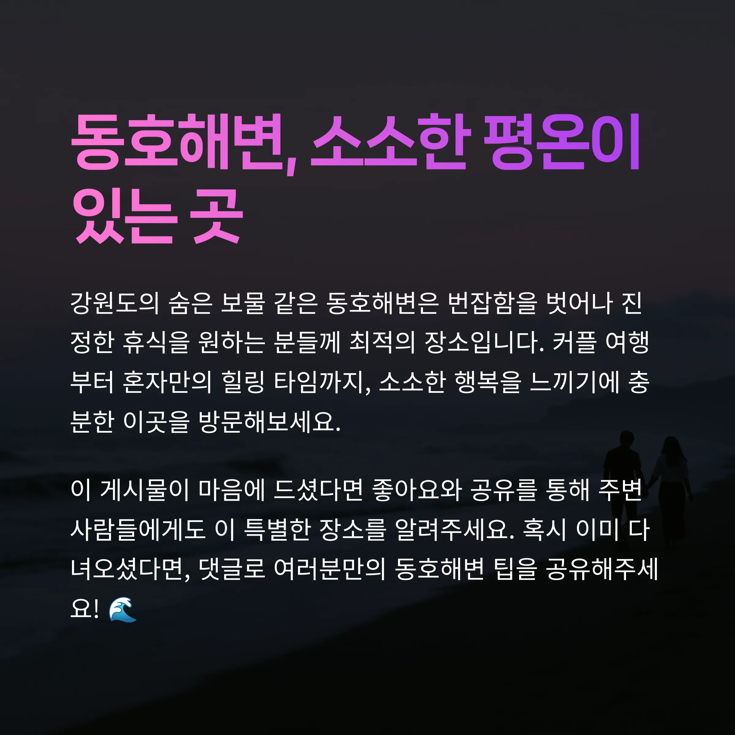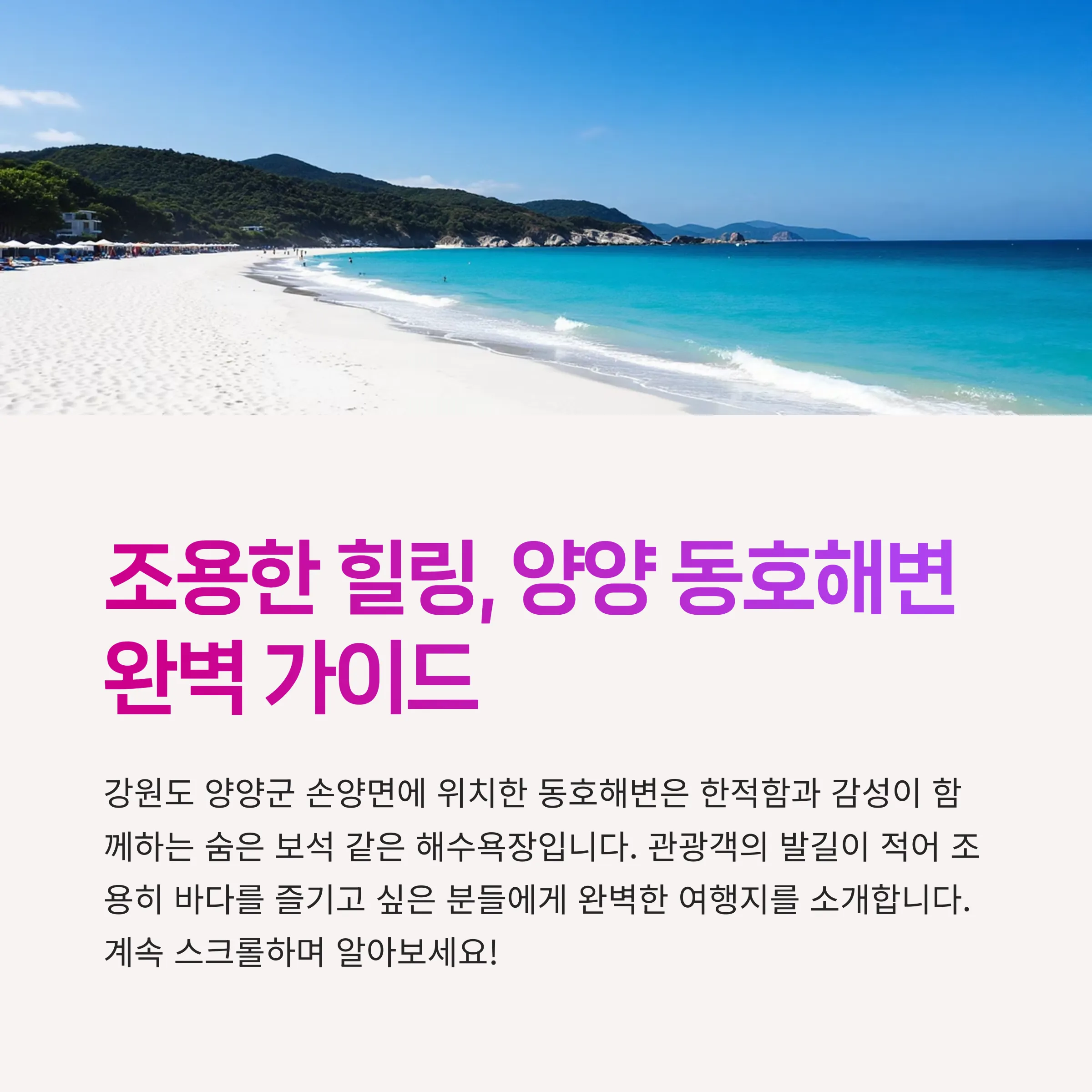 이번 주말, 동호해변에서 사랑하는 사람들과 함께 잊지 못할 힐링여행을 떠나보세요.