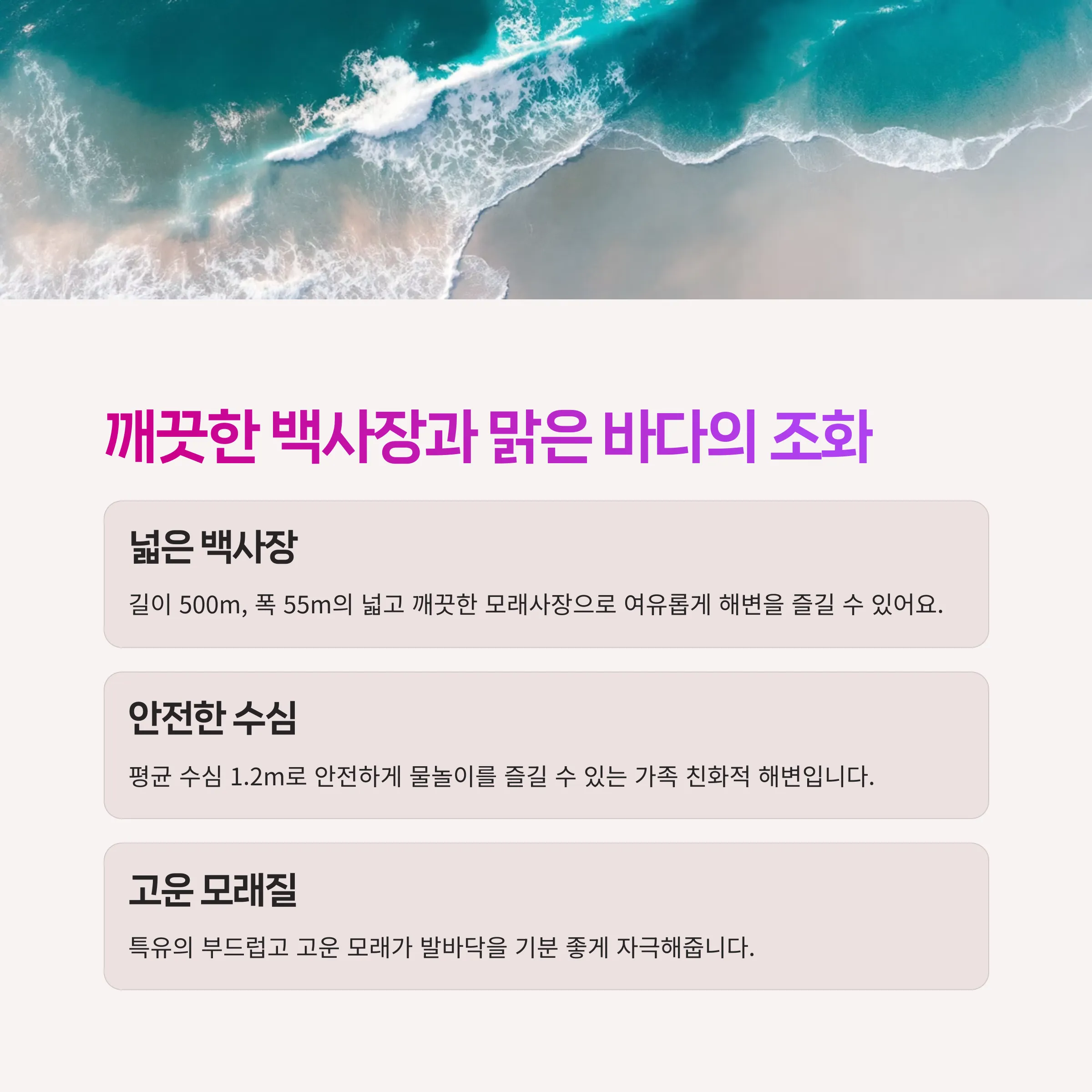 약 500m 길이의 백사장과 1.2m의 평균 수심은 안전하면서도 여유로운 해변 활동에 적합합니다.