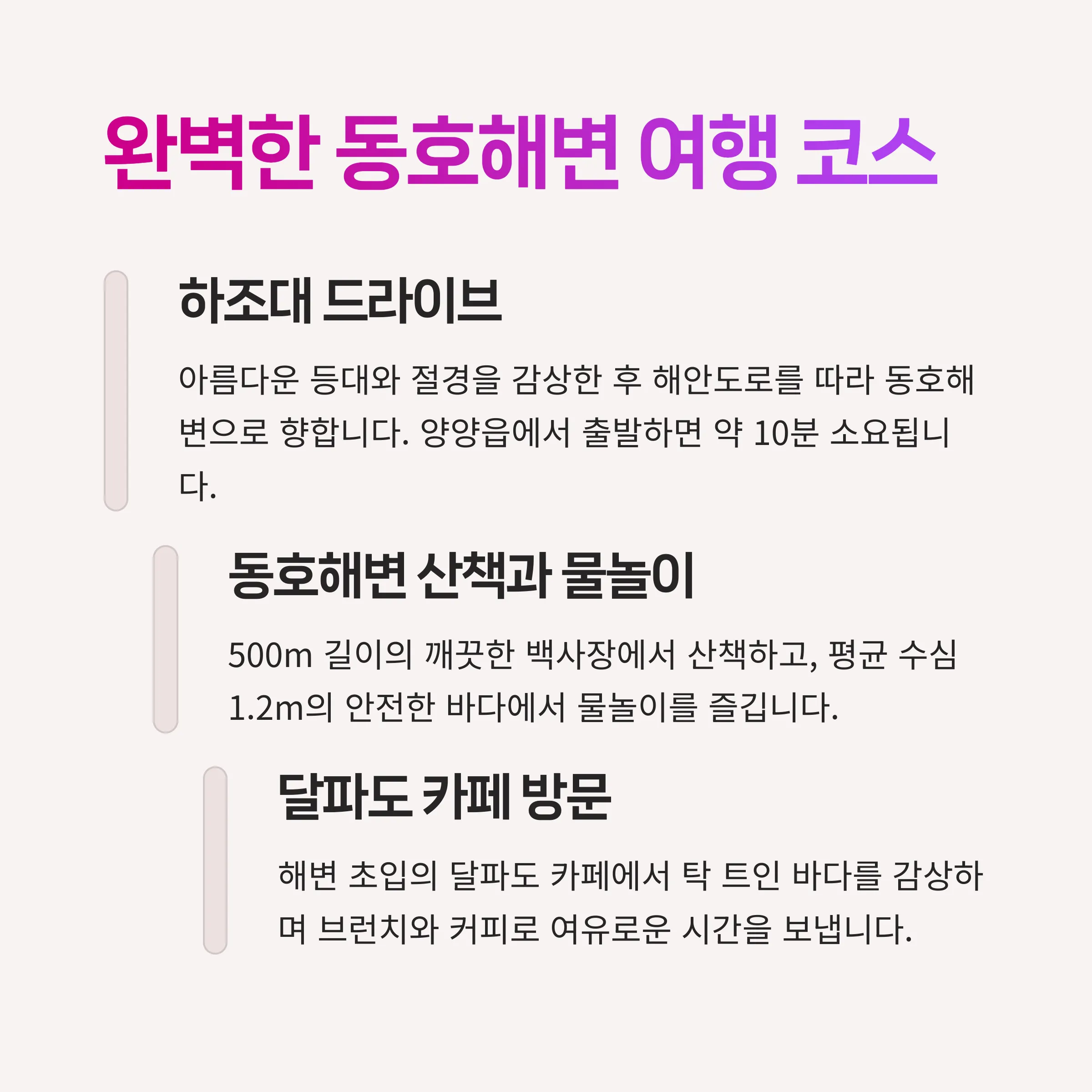 3. 동호해변은 관광객 붐비지 않아 조용한 데이트와 힐링 코스로 제격입니다.