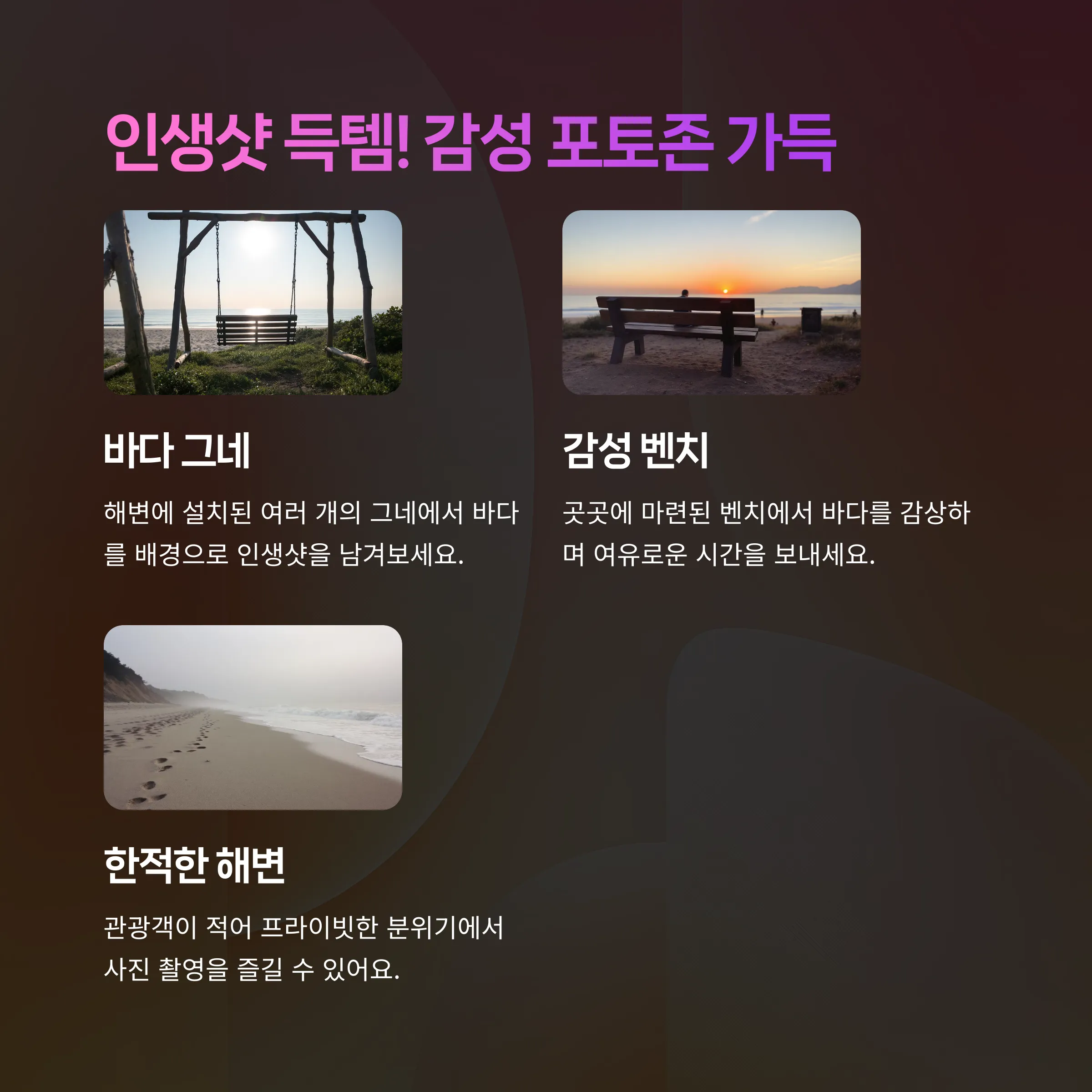 4. 해변의 그네 감성 포토존에서 예쁜 추억을 남겨보세요.