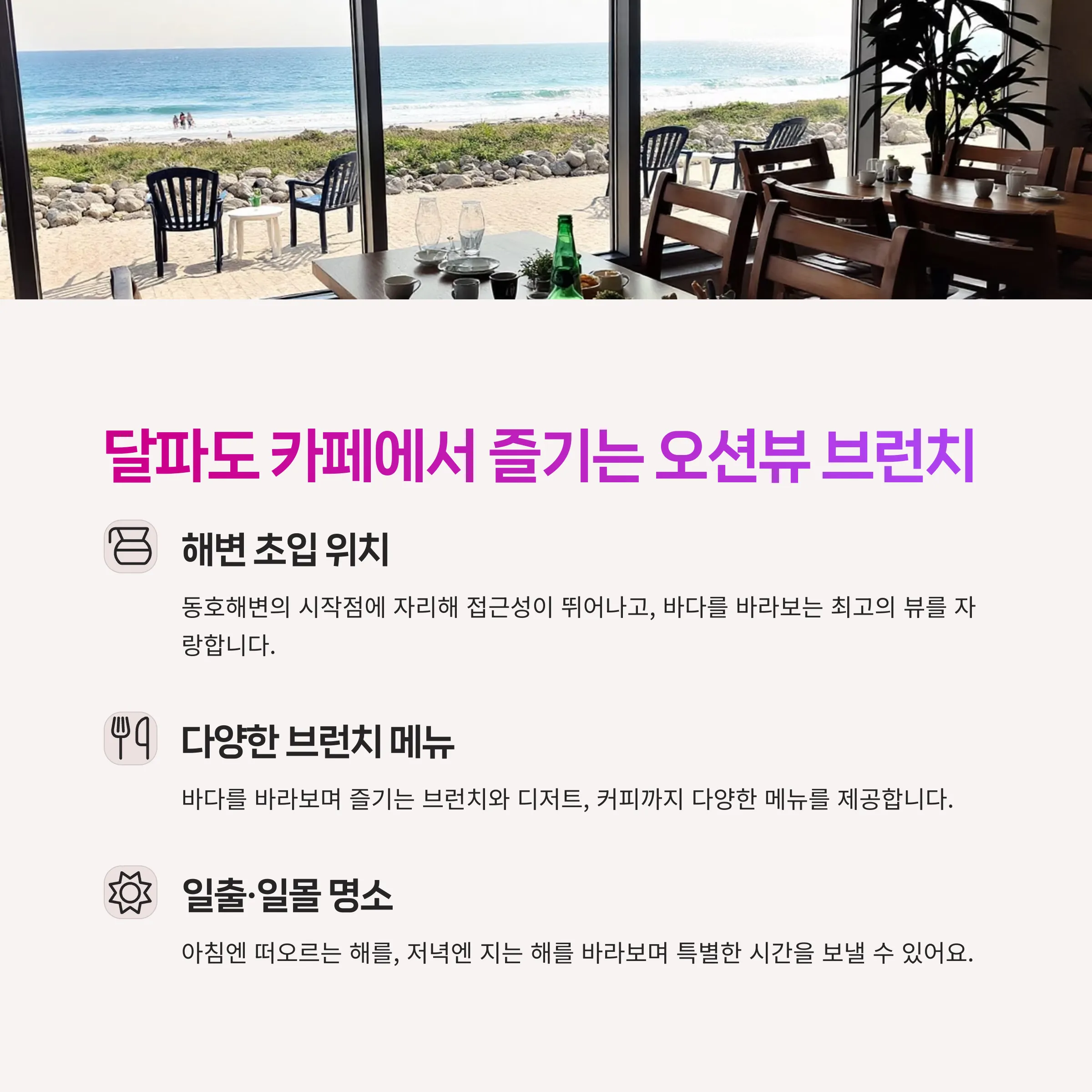또 다른 매력 포인트는 동호해변에 자리 잡은 다양한 오션뷰 카페로, 특히 '달파도 카페'는 필수 방문지로 추천됩니다.