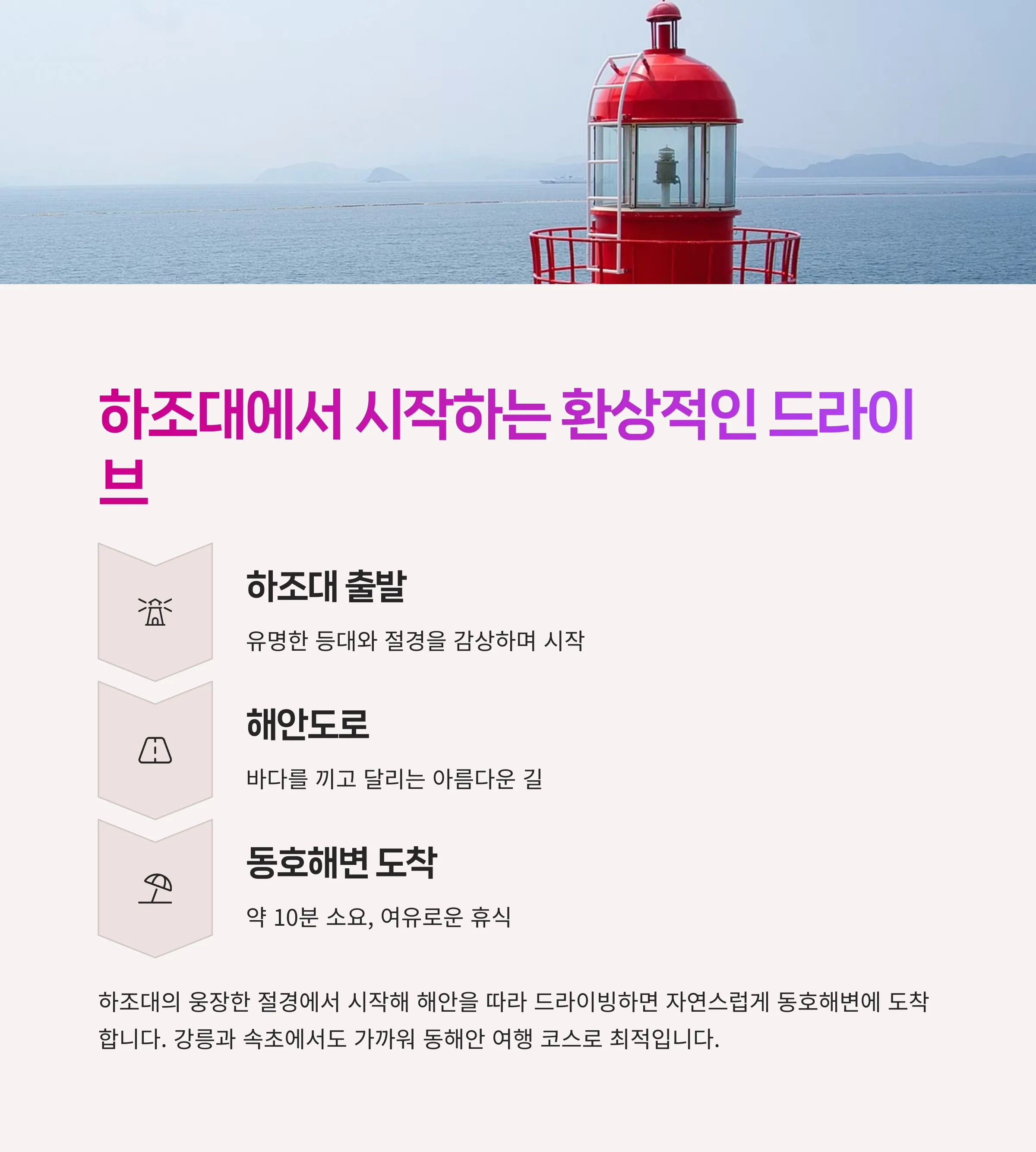 | 추천 드라이브 코스 | 하조대 → 낙산사 → 동호해변 |