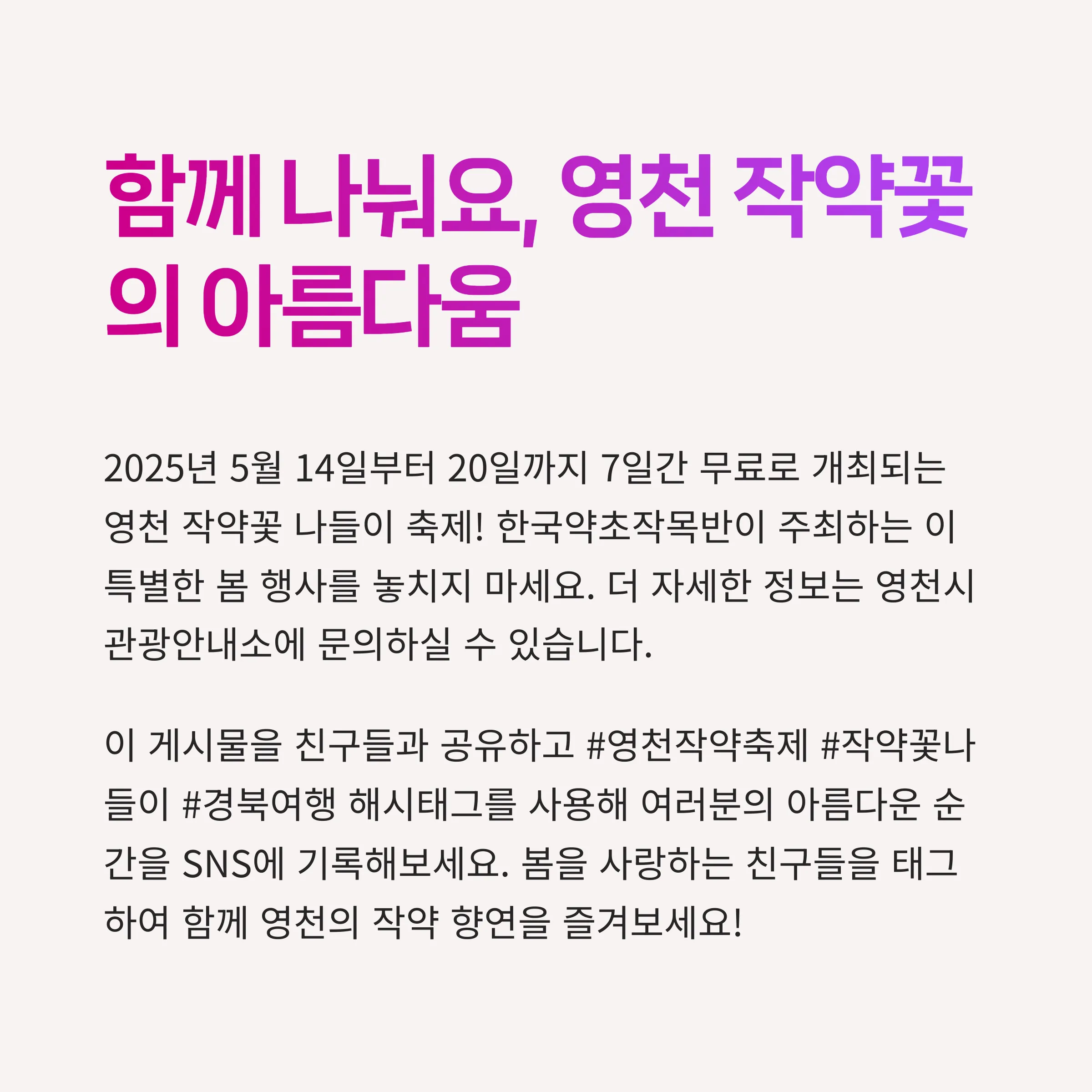 행사는 무료 입장으로 누구나 즐길 수 있습니다. 관람 후 작약 관련 제품과 영천 특산물 등 특별한 기념품도 챙겨보세요.