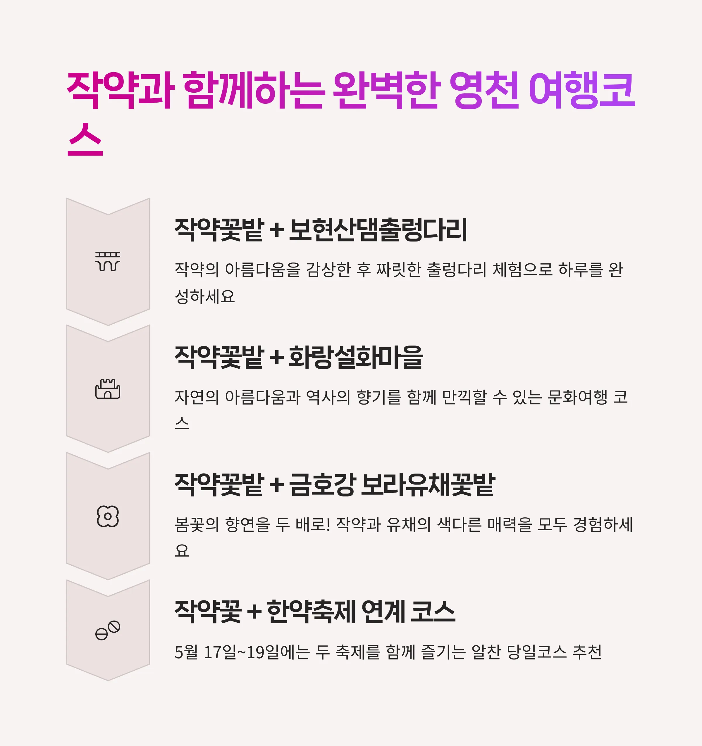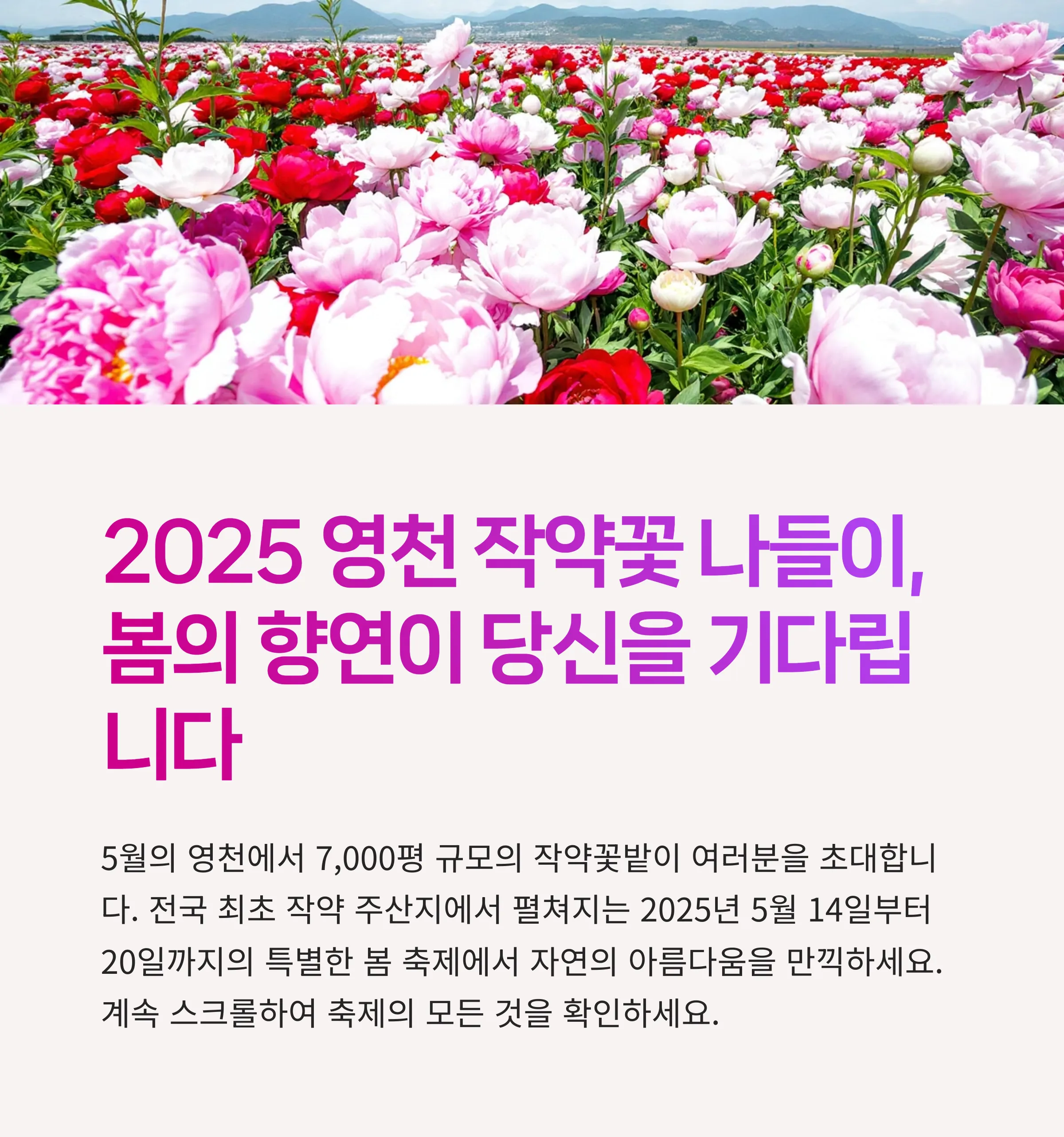 여행님의 고민을 덜기 위해 매년 지역 축제로 가치를 더해가는 경북 영천의 아름다운 작약꽃 여행 정보를 준비했어요.