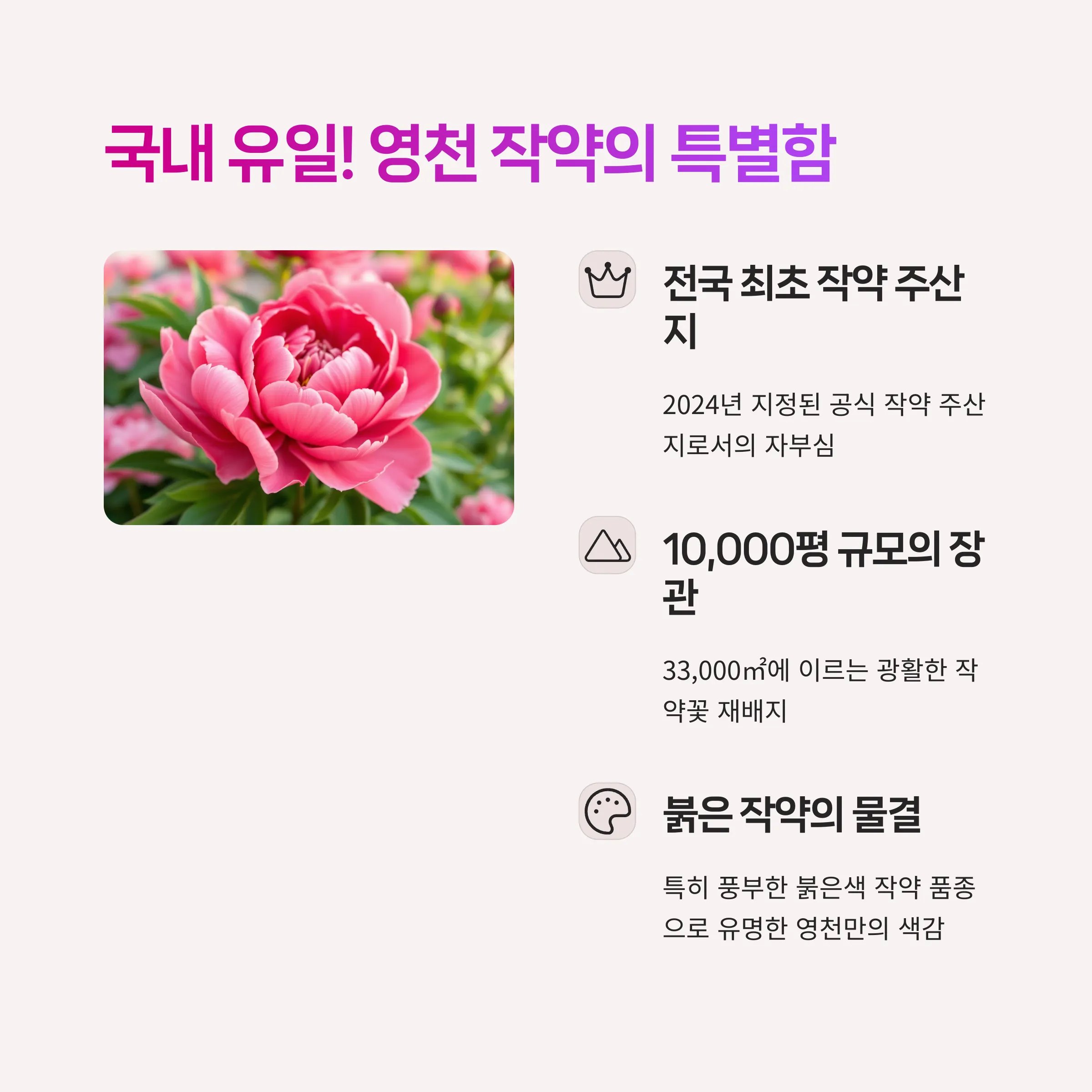- 2만3000㎡ 면적의 대규모 작약밭에서 화려한 봄 경관 감상