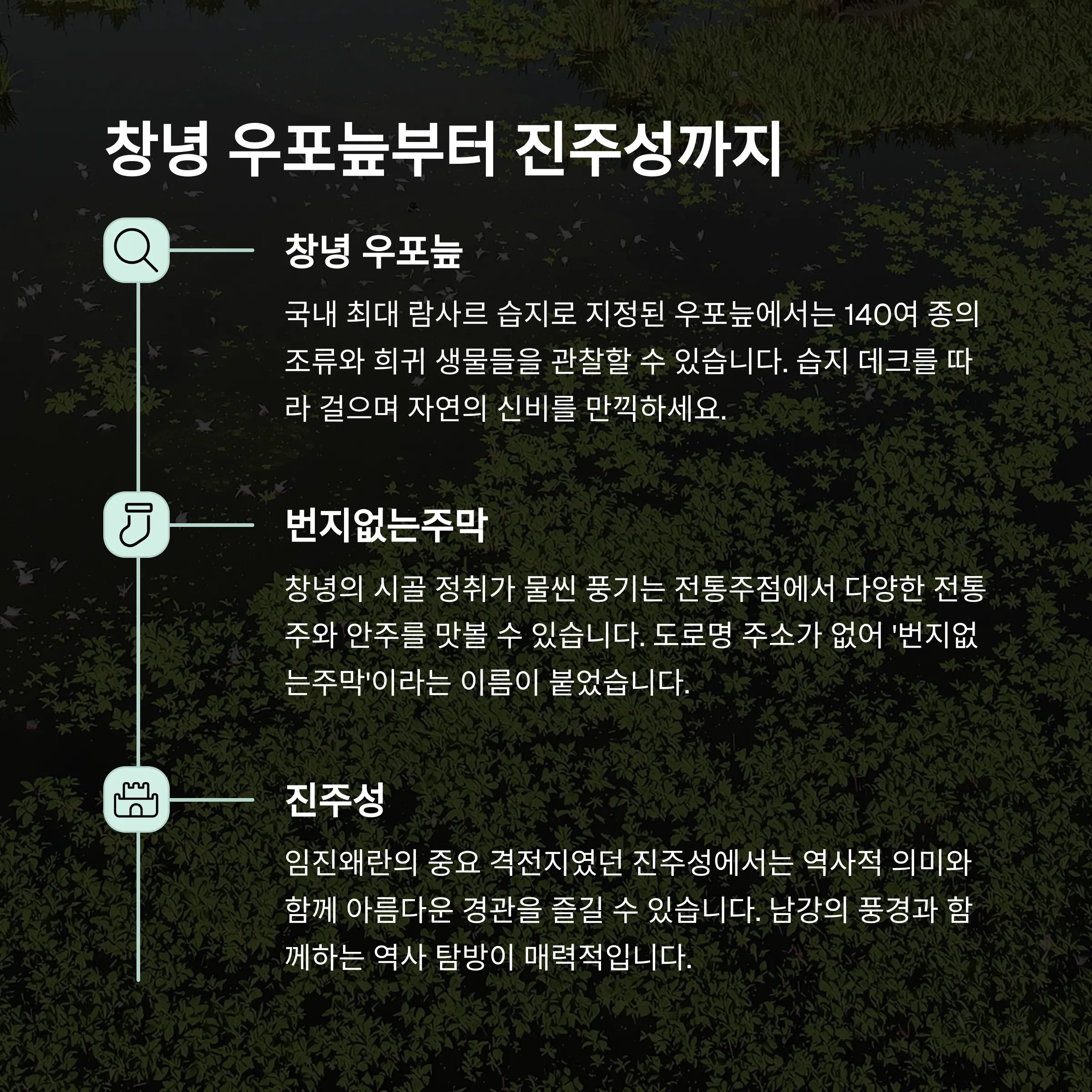 남해 바다의 시원한 경치와 창녕 우포늪의 힐링 산책로를 포함한 여정은 여행을 더욱 특별하게 만들어줍니다.