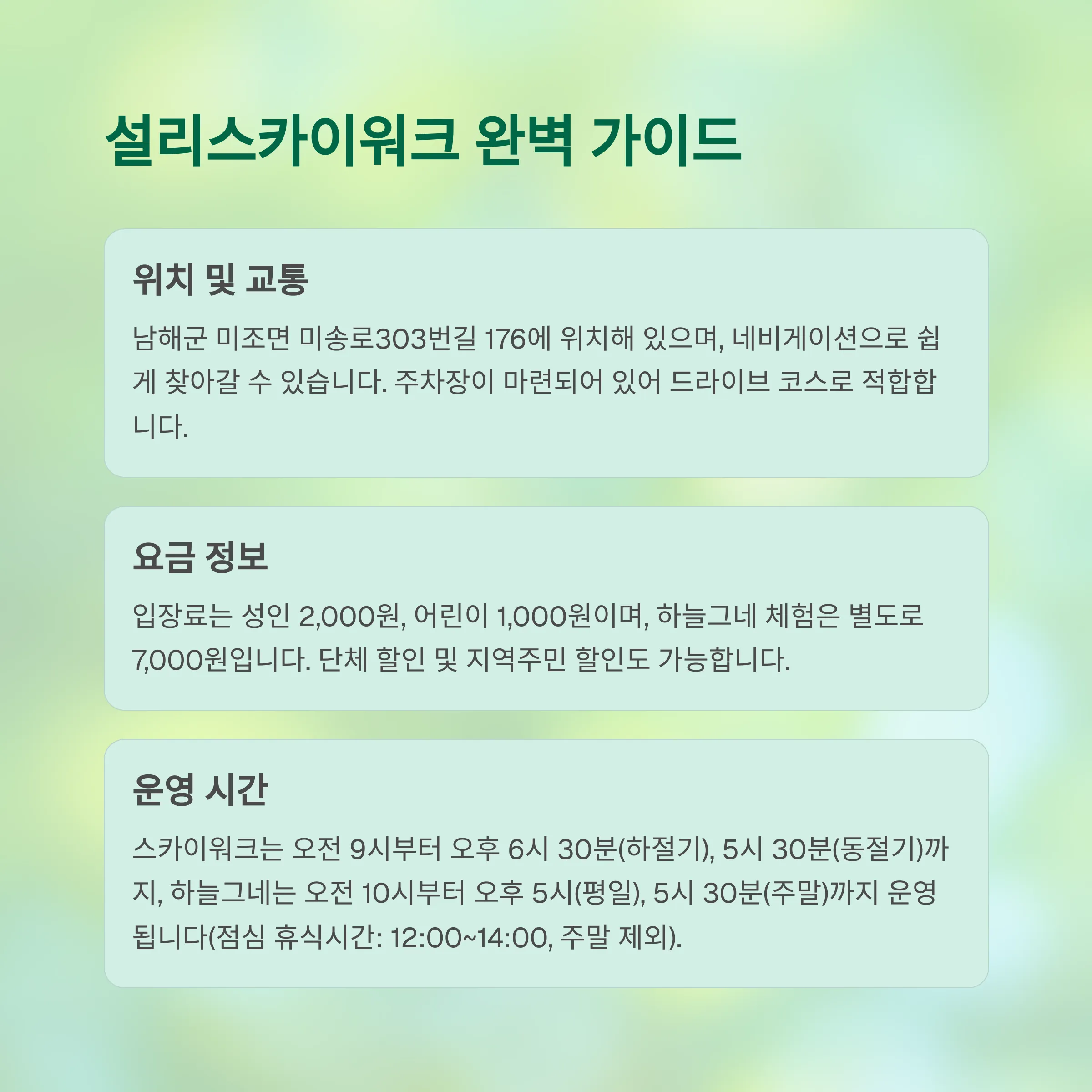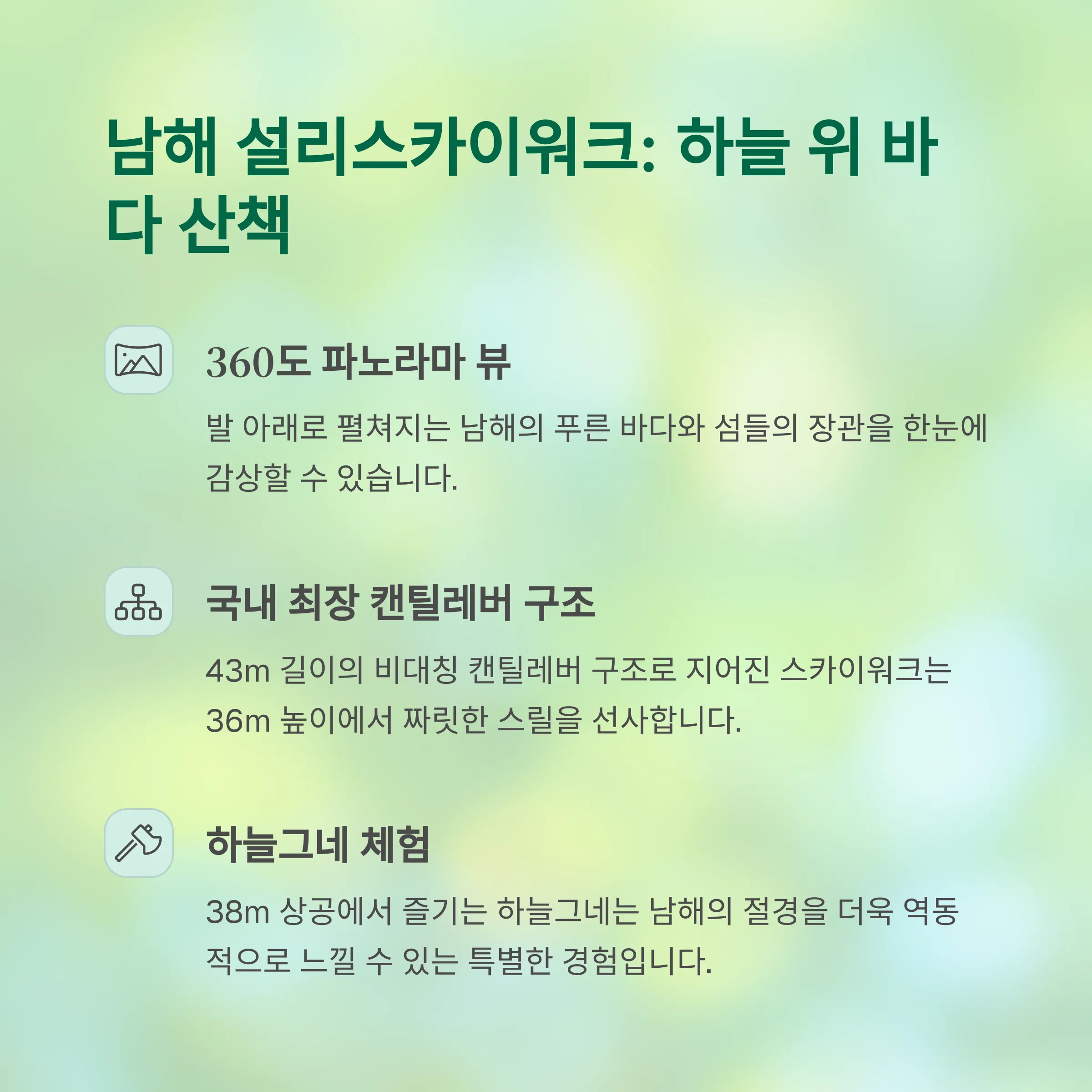 | 남해 설리스카이워크 | 약 2시간 | 스카이워크, 카페 |