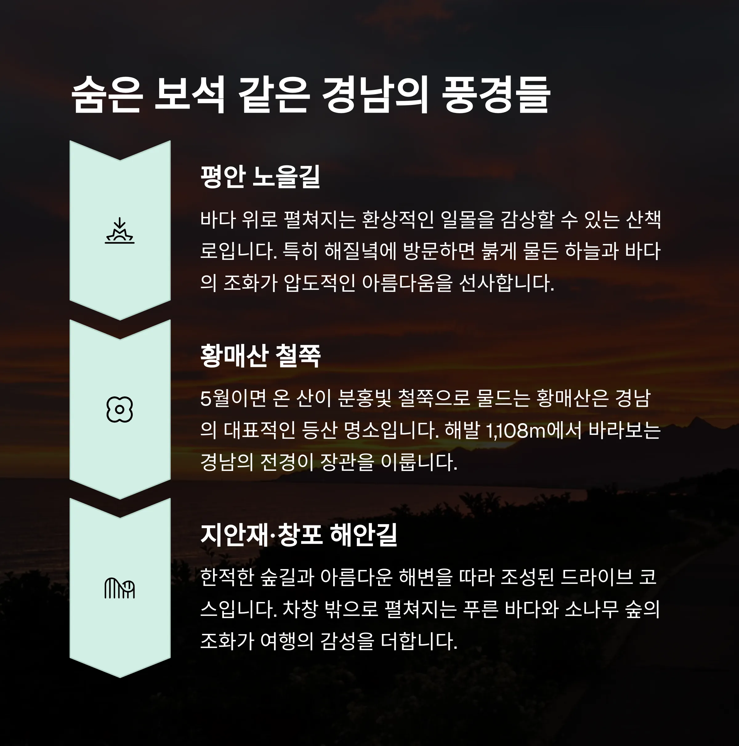 경남 드라이브 코스는 다양한 자연과 역사를 느낄 수 있는 매력적인 장소들로 가득합니다.