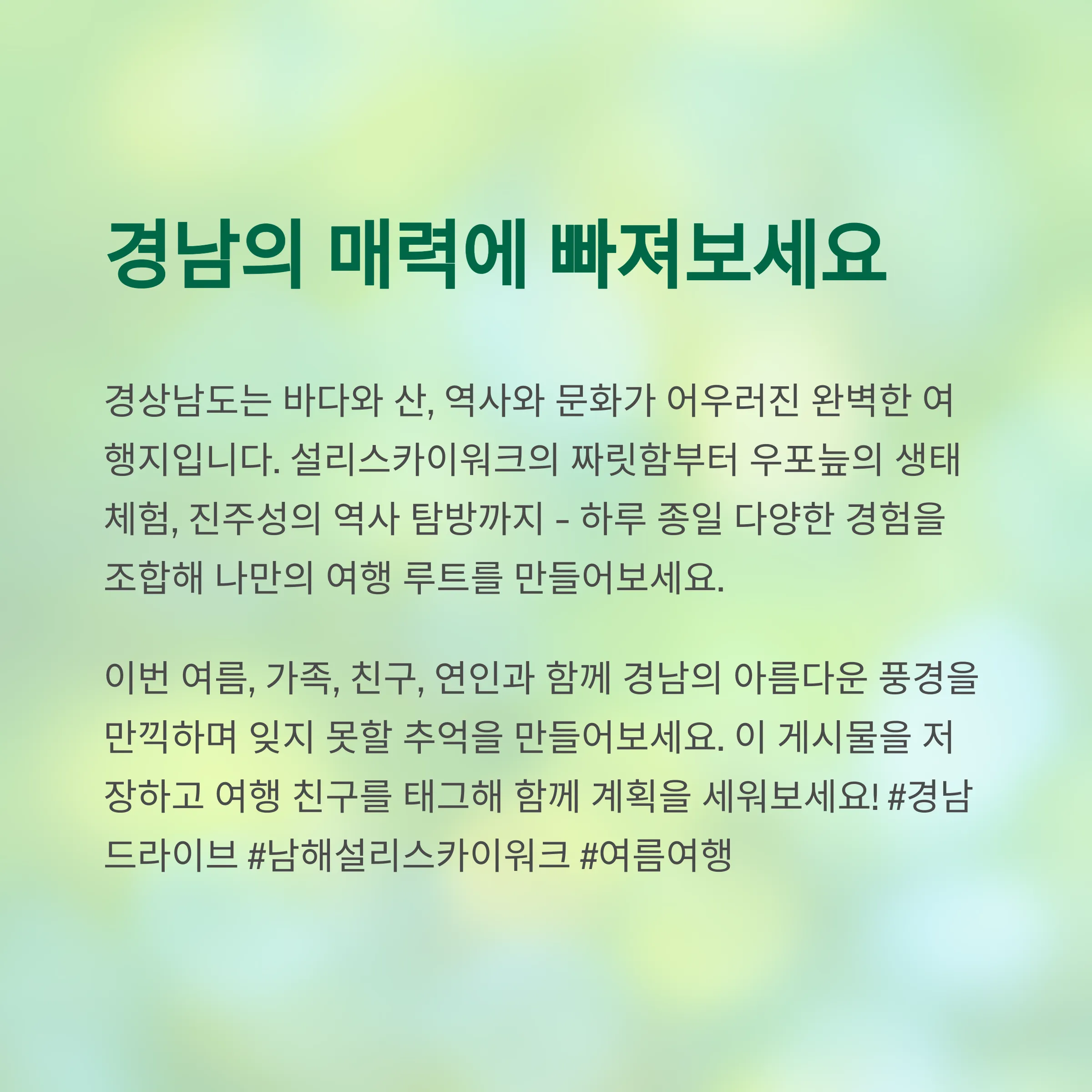 여름철 여행을 계획할 때는 경남의 자연적인 매력을 충분히 만끽할 수 있는 일정으로 구성해보세요.