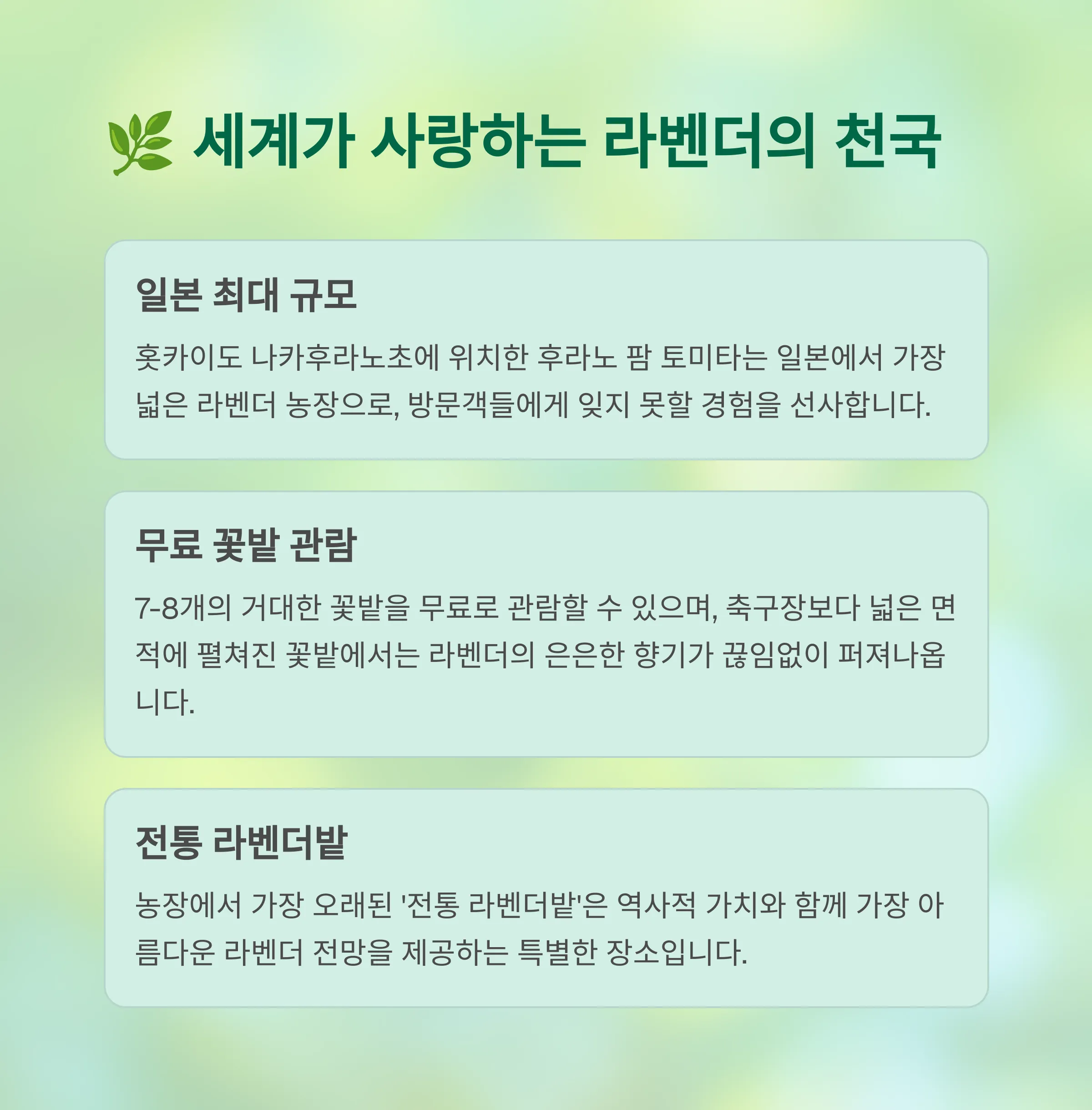 후라노 팜 토미타는 일본 북해도에서 놓칠 수 없는 여행지로 손꼽히며, 계절마다 특별한 매력을 제공합니다.