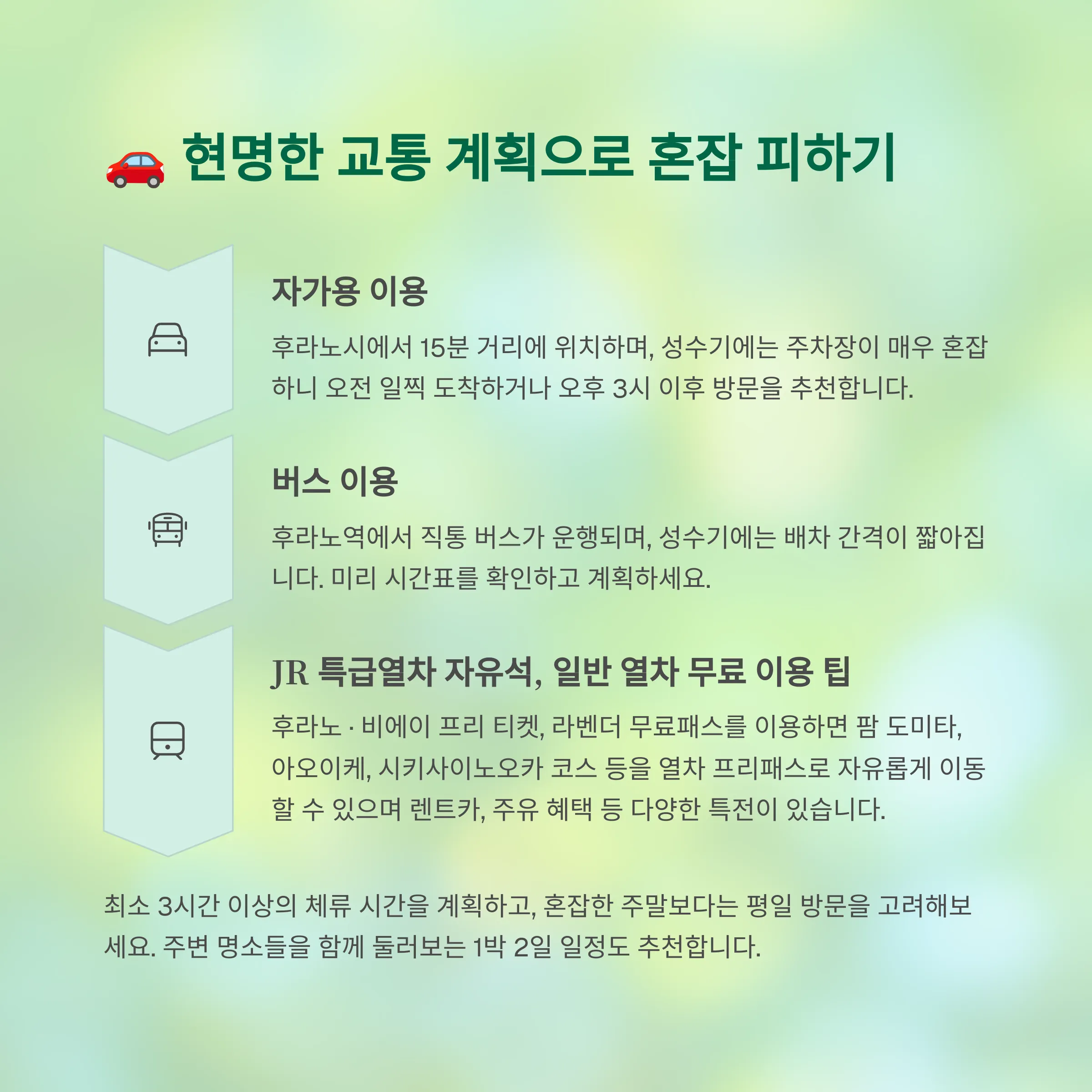주차장은 시즌에 따라 붐빌 수 있으니 대중교통을 적극 활용하세요.