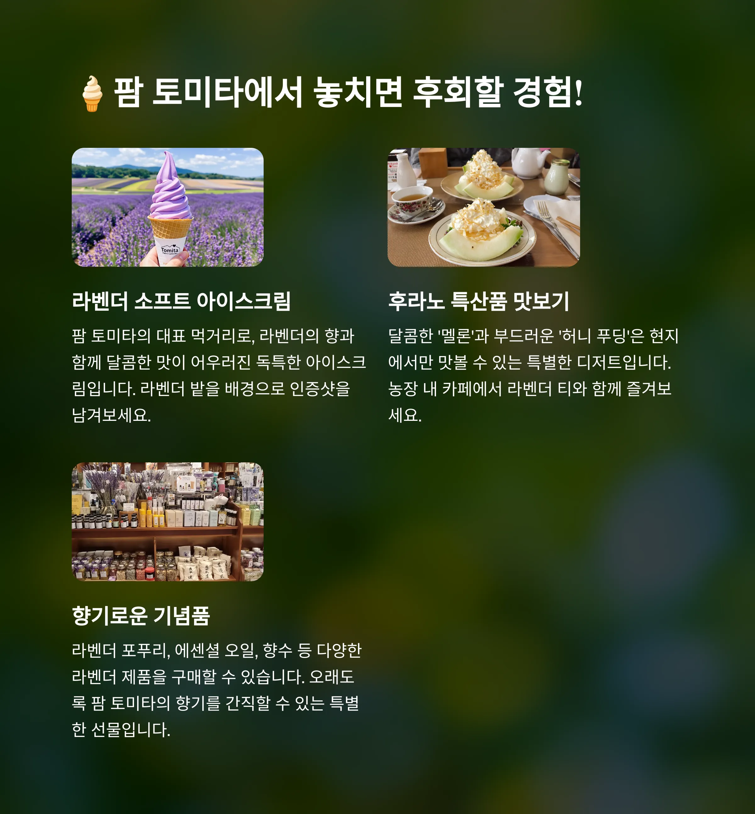 | 팜 토미타에서 가장 유명한 음식은 바로 라벤더 소프트 아이스크림입니다. 라벤더의 은은한 향과 달콤한 맛이 조화를 이루며, 뜨거운 여름날 여행객들에게 큰 인기를 얻고 있습니다. 또한, 팜 토미타 내 카페에서는 라벤더를 활용한 특별 음료와 독특한 디저트를 즐길 수 있습니다. 어린이와 성인 모두 만족할 만한 다양한 음식 옵션이 준비되어 있습니다. 방문 전에 운영 시간과 메뉴를 미리 확인하는 것도 좋은 팁입니다. |