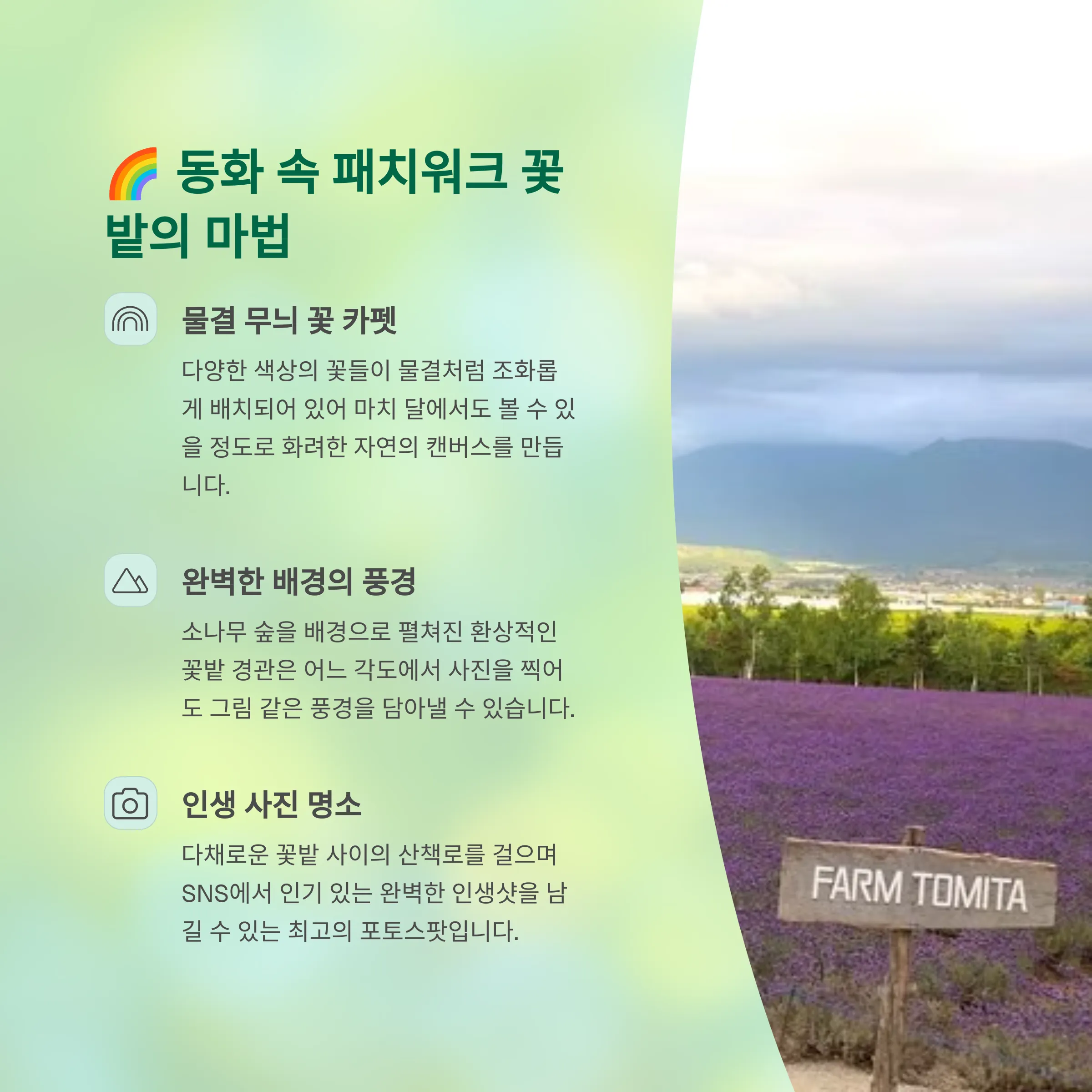 후라노 팜 토미타는 일본 북해도의 대표적인 관광 명소로, 특히 라벤더 꽃밭과 계절 풍경으로 유명합니다.