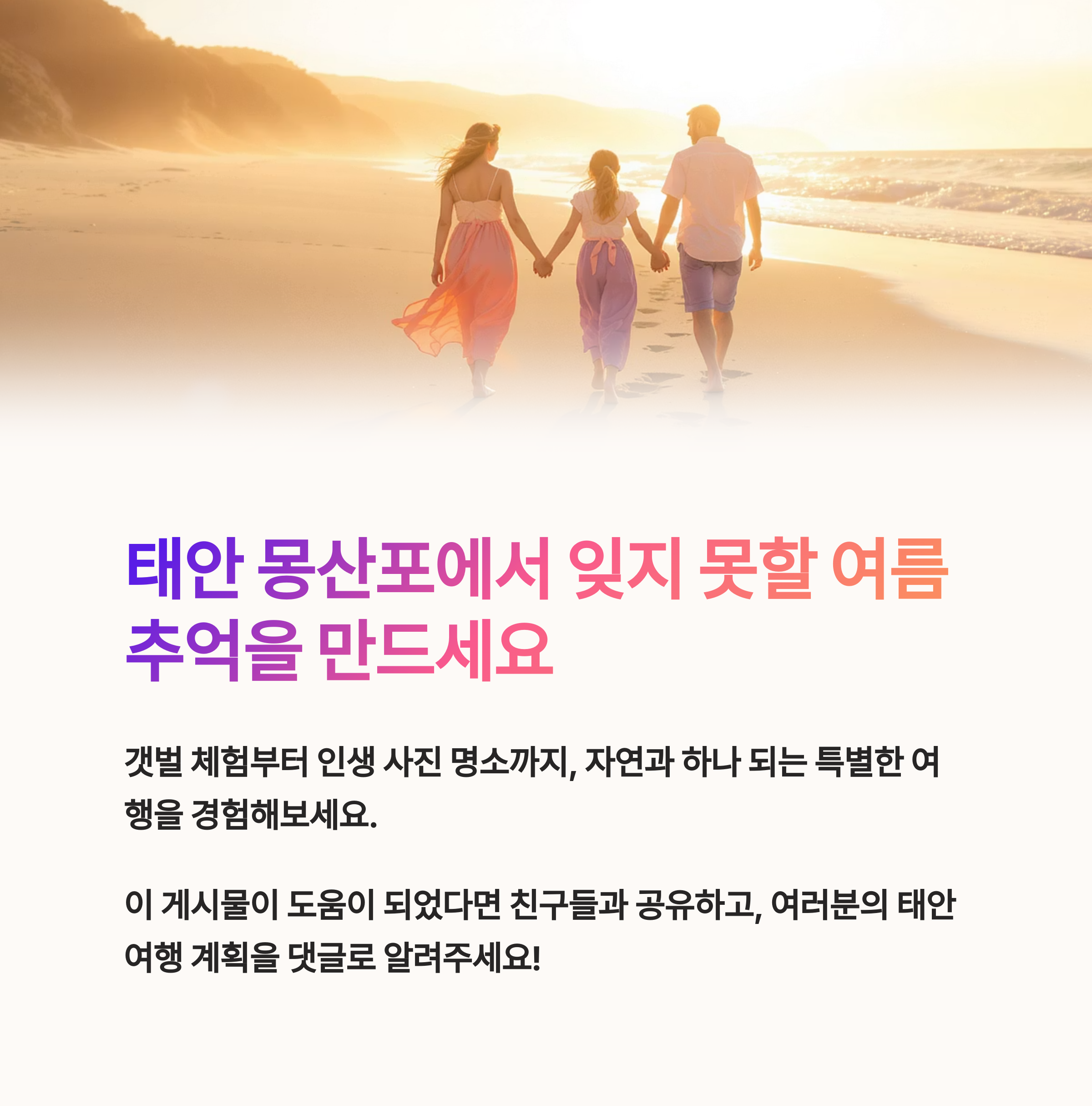 자연과 함께하는 특별한 여름 여행을 떠나고자 한다면, 가족과 친구들과 함께 태안 몽산포 해수욕장을 꼭 방문해 보세요.